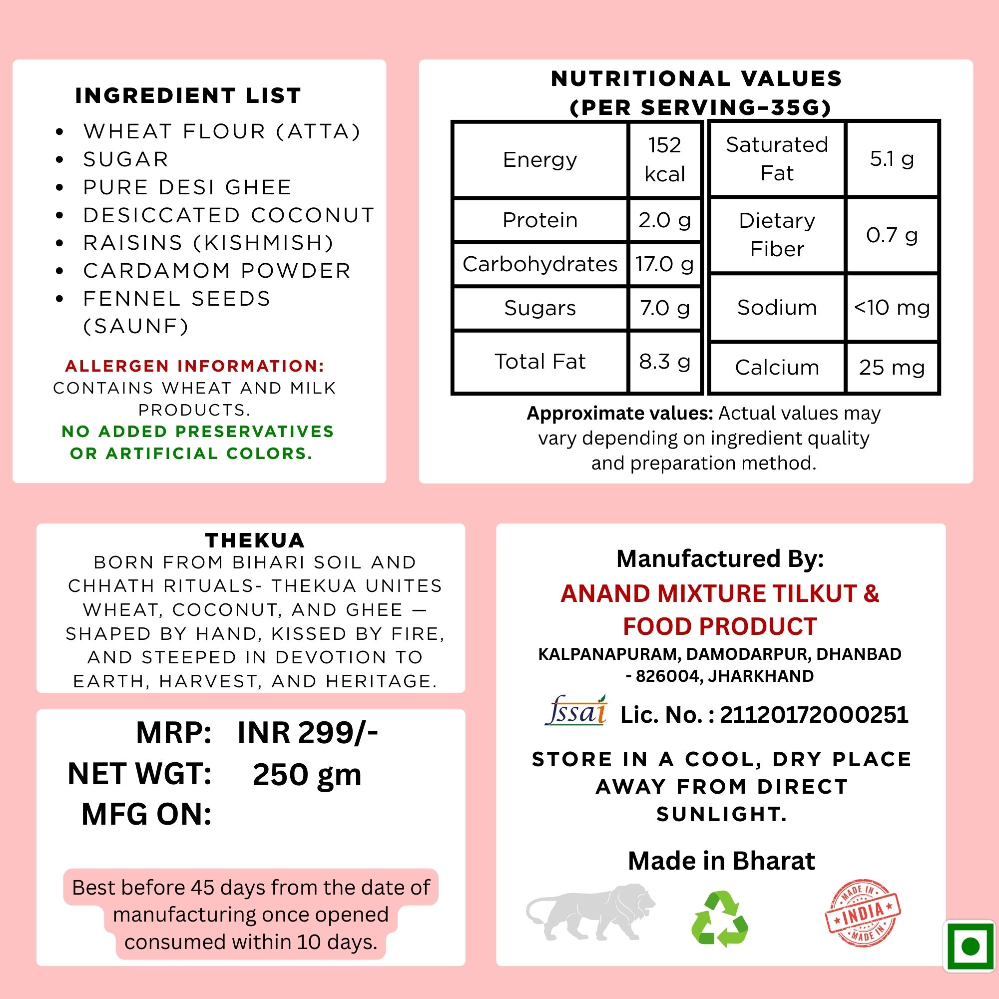 Born from Bhojpuri soil and Chhath rituals, Thekua unites wheat, coconut, and ghee — shaped by hand, kissed by fire, and steeped in devotion to earth, harvest, and heritage.